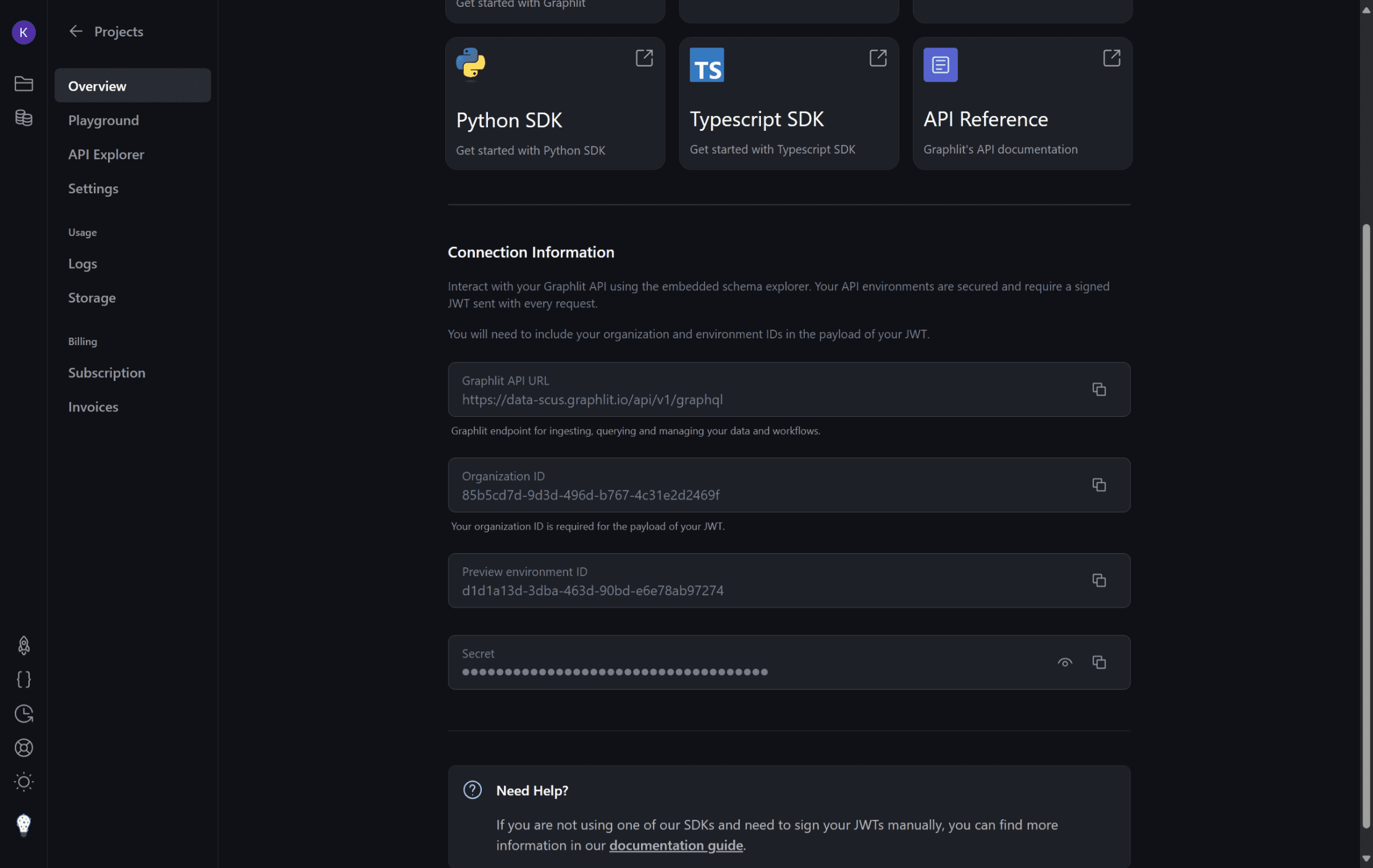 You can find the organization ID, environment ID, and JWT secret in your Graphlit project.