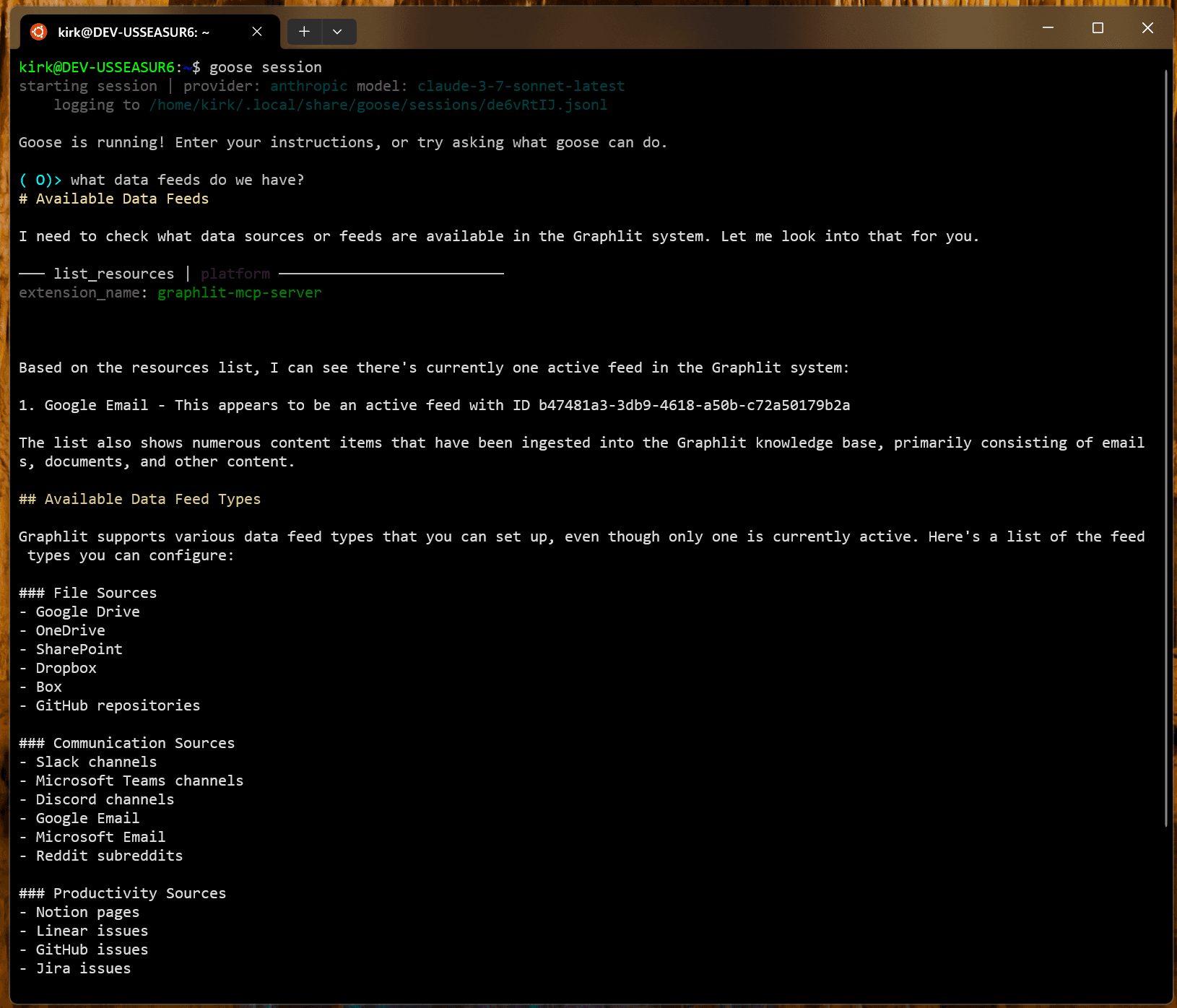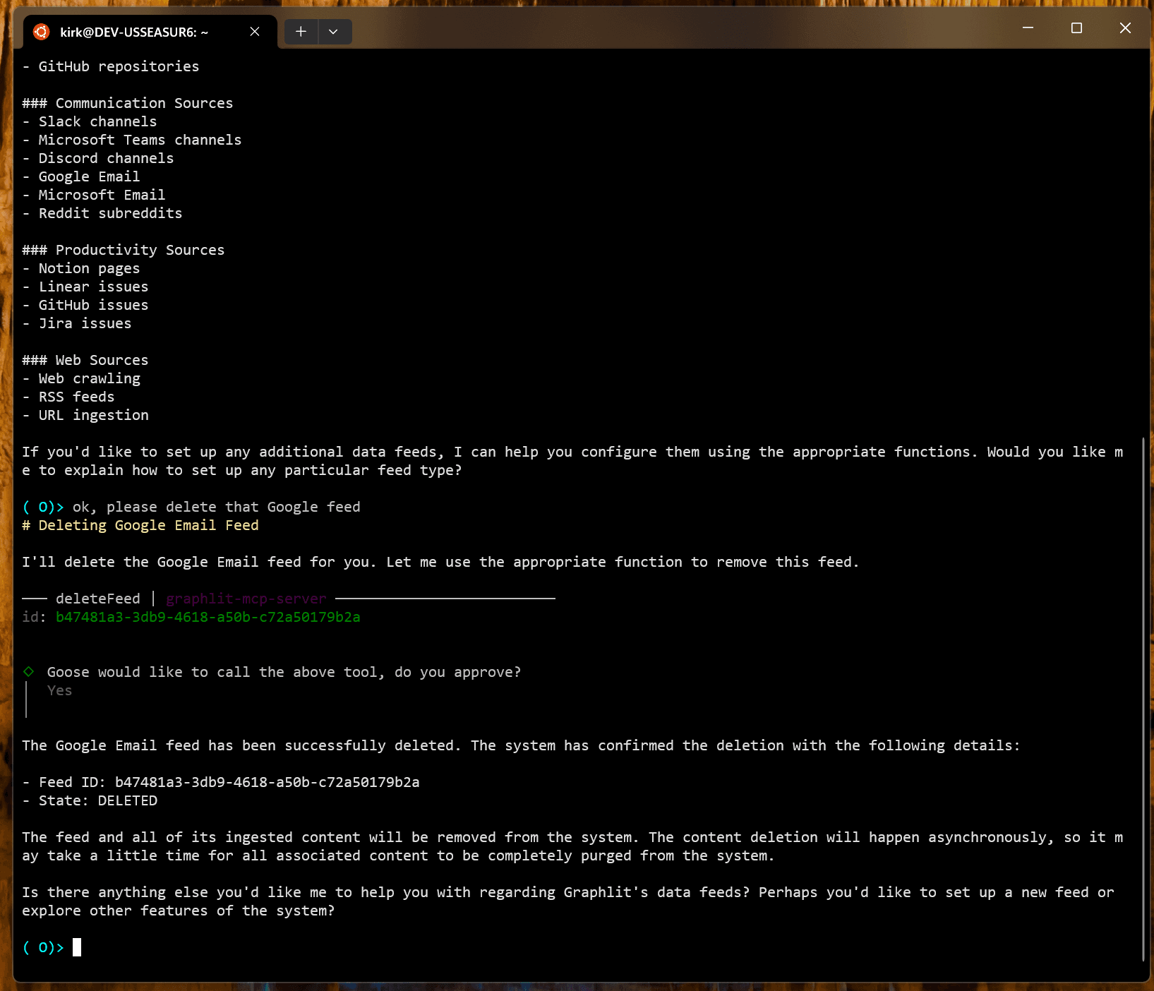 Here we can ask Goose for the existing data feeds, and then ask it to delete each one.