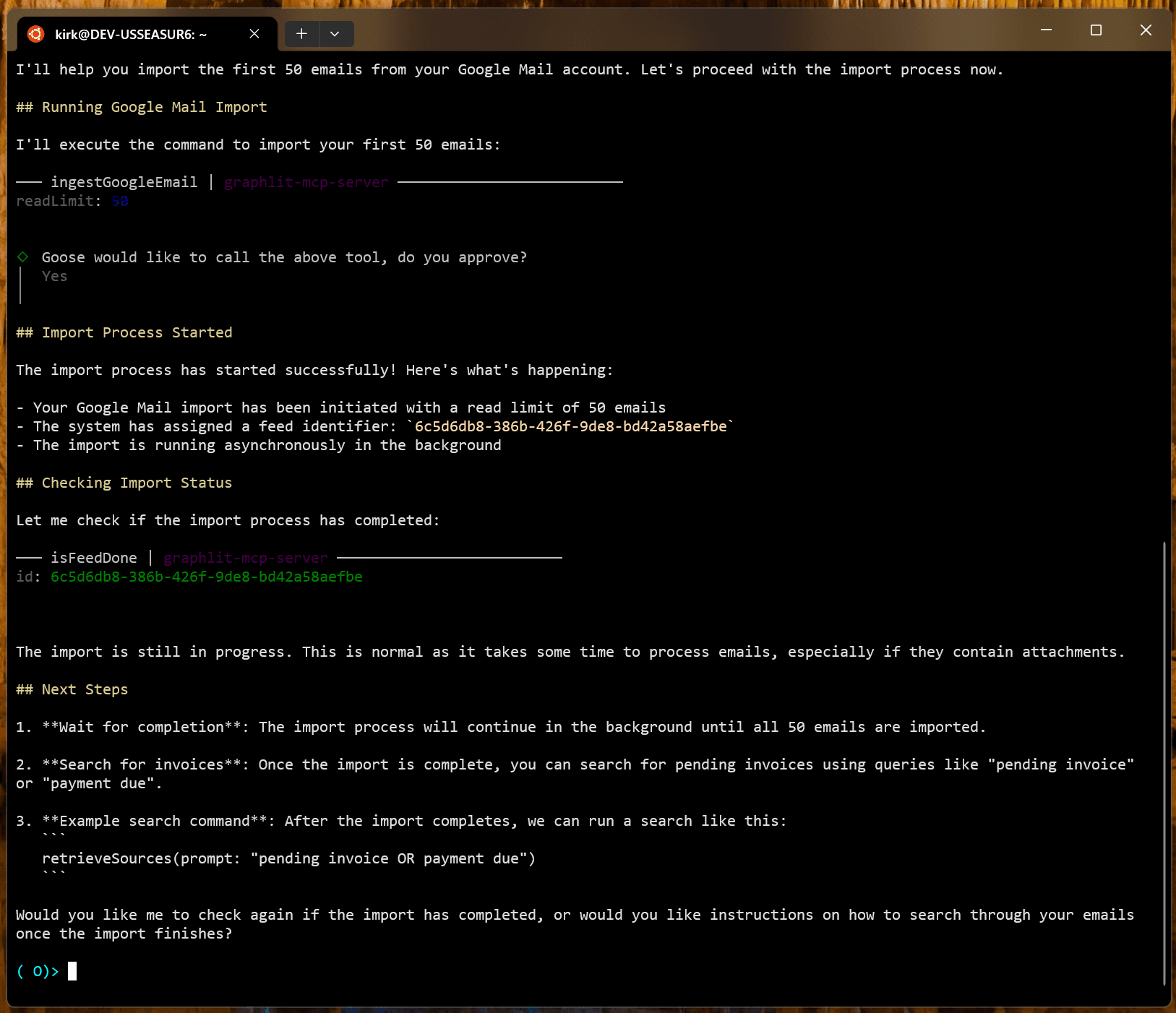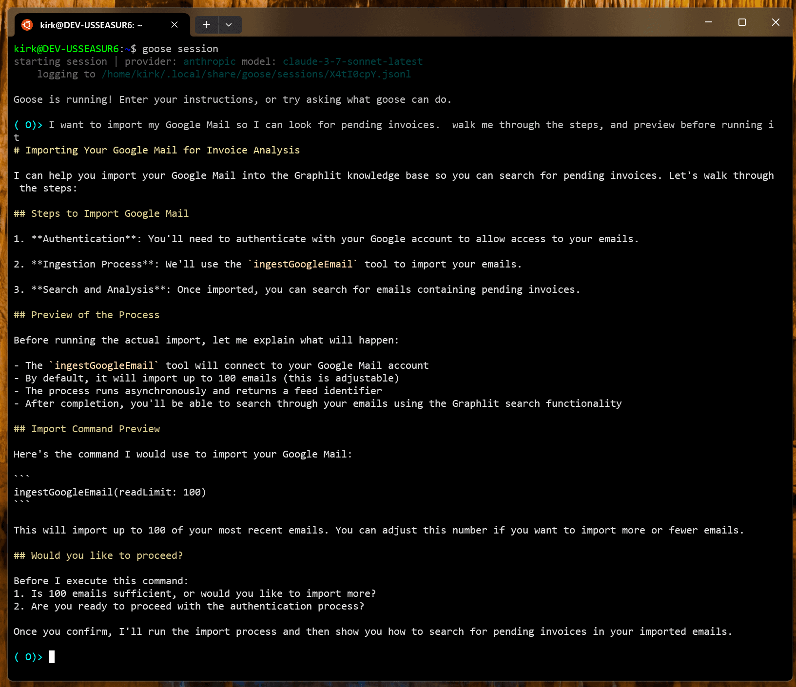 By asking Goose to help us ingest our Google email, and asking it to preview the steps first, it walks us through ingestion step by step.