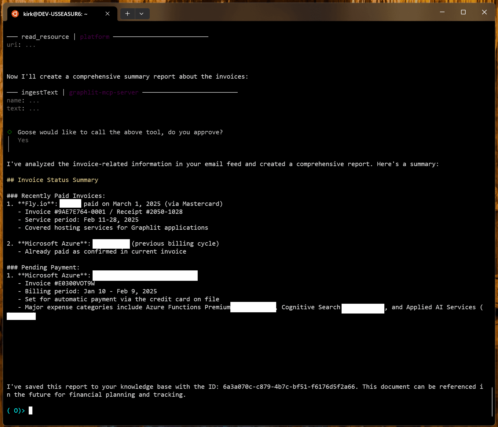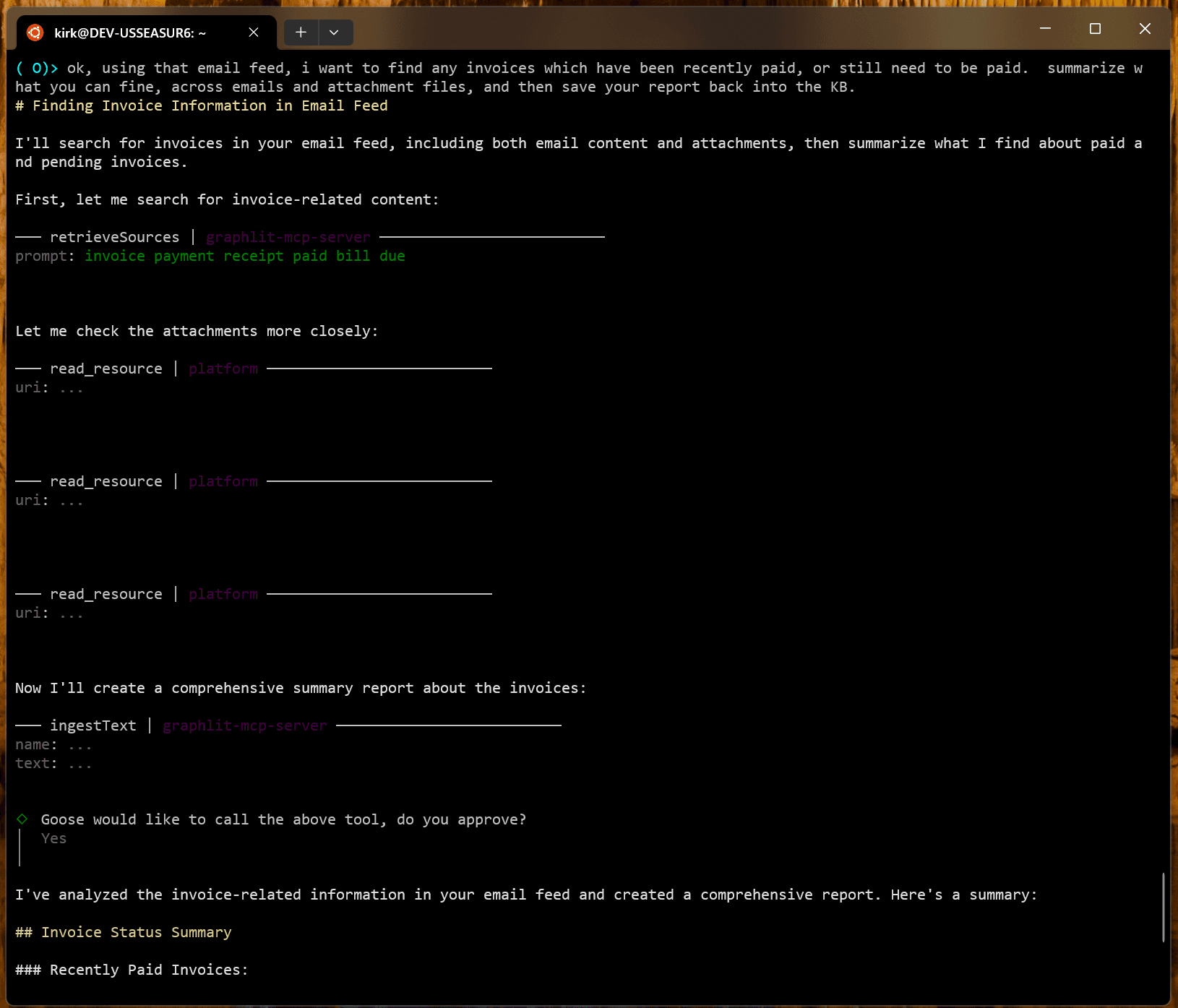 Now that it has the relevant emails, it summarizes recently paid invoices and those which require payment.