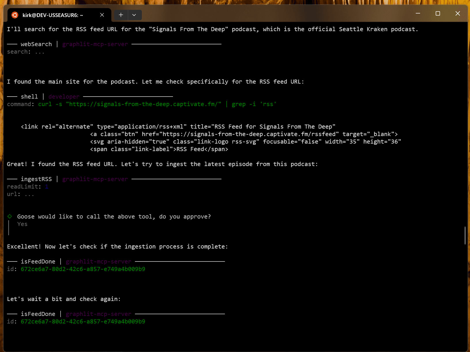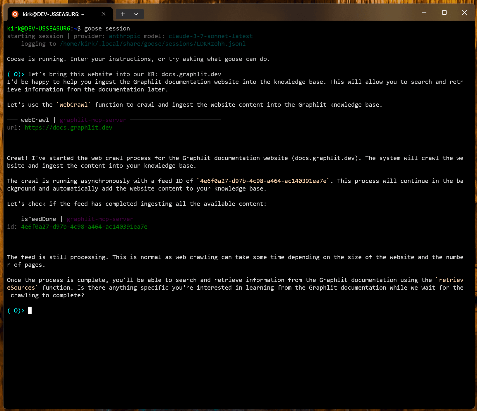 Goose is smart enough to see there's a tool called 'isFeedDone' to poll on the completion of feed ingestion.