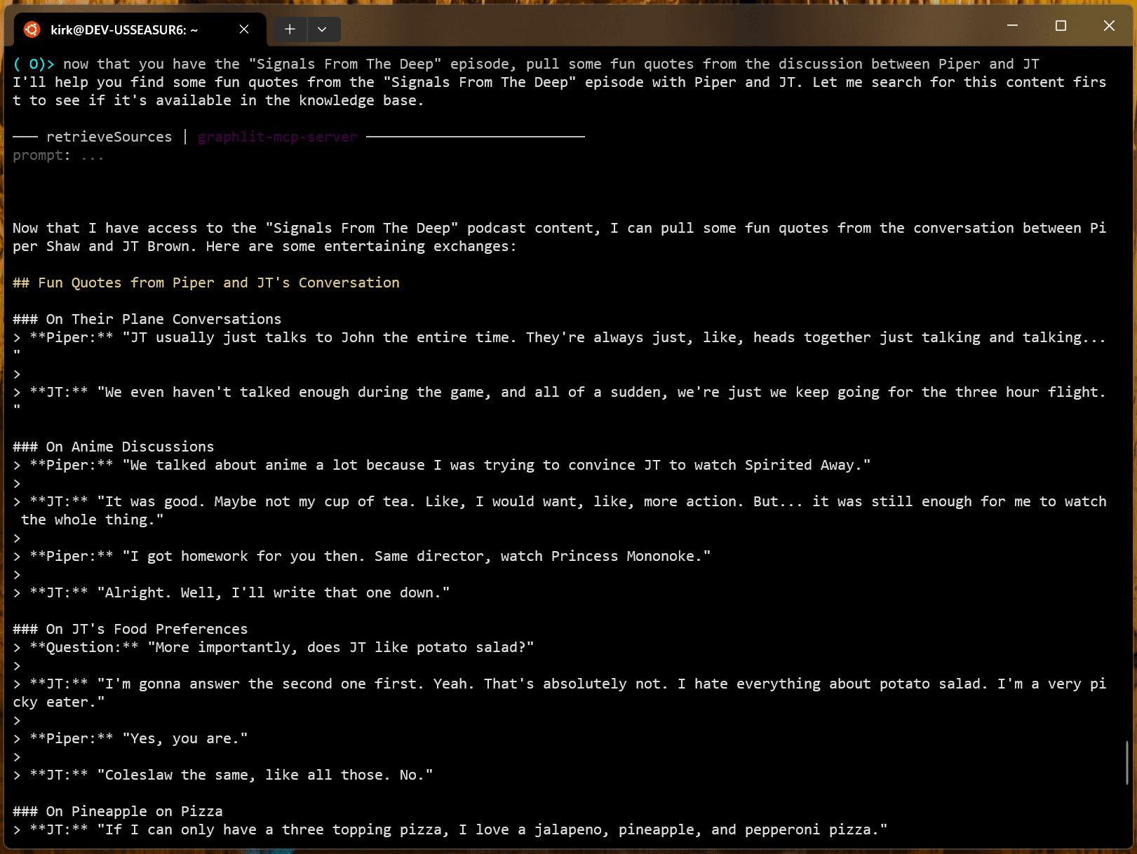 Once the podcast episode has been ingested, we can ask Goose to pull some relevant quotes from the transcript.